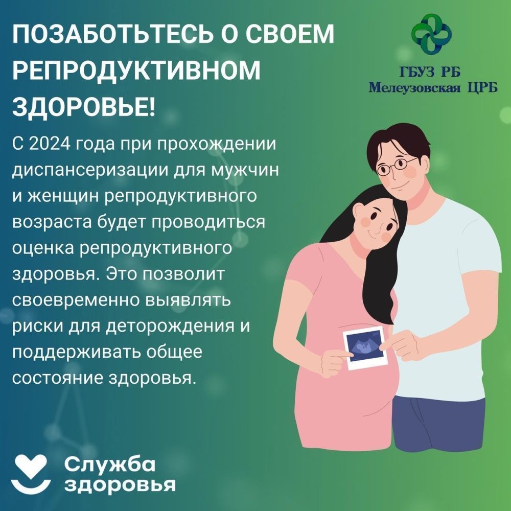 С 2024 года при диспансеризации проводится оценка репродуктивного здоровья женщин и мужчин. Цель: выявление заболеваний и факторов риска, которые могут негативно повлиять на репродуктивное здоровье, беременность, роды и послеродовой период.